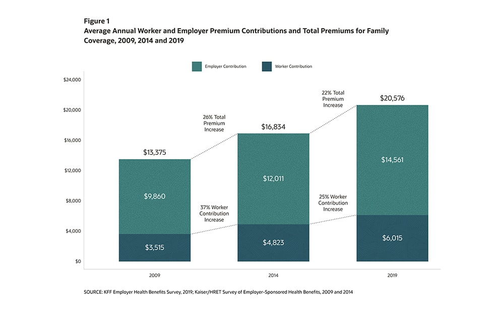 Figure 1 Average Annual Worker and Employer Premium Contibutions and Total Premiums for Family Coverage, 2009, 2014 and 2019