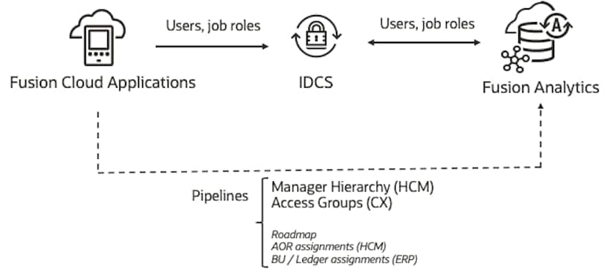 By default, Oracle Fusion Analytics is provisioned with single sign-on by Oracle Identity Cloud Service, which synchronizes users and out-of-the-box roles from Oracle Cloud Applications. In addition, Oracle Identity Cloud Service can also synchronize users with other third-party systems.