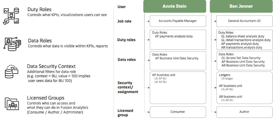 The security administration module in Oracle Fusion Analytics maps out-of-the-box Oracle Cloud Application job roles to predefined Oracle Fusion Analytics data and duty roles.