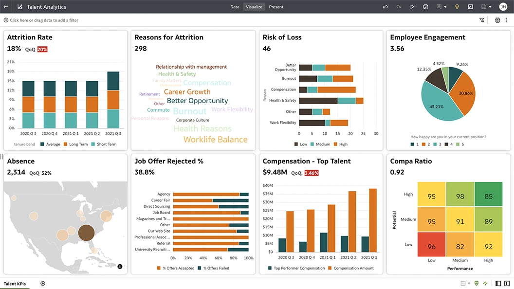 Increase visibility across all HR processes, including recruiting, attrition, employee engagement, skills, talent, absence, compensation, and more, with best practice key performance indicators (KPIs).