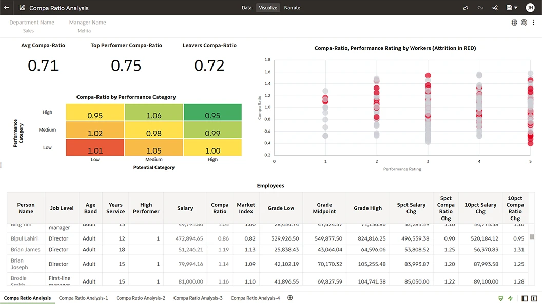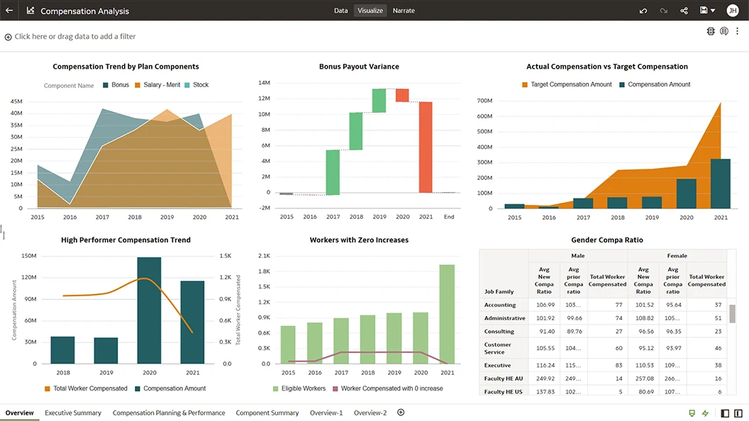 Get a consolidated view of compensation plans by analyzing their components and associated budgets over time. Slice and dice by any number of worker dimensions and drill through to different levels of compensation, including worker, team, and department details.