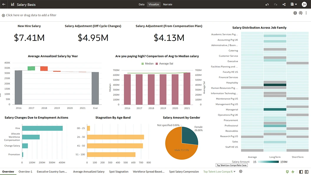 View workforce salary distribution to spot salary compression and stagnation in the organization. Examine salary ranges, off-cycle salary changes, worker's salary details, and supporting historical trends in a single view.