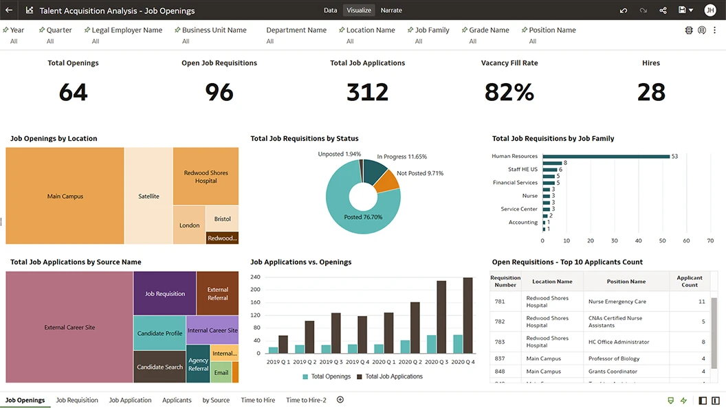Assess the operational efficiency of your recruiting process—by business unit, department, and job family—with KPIs, such as time-to-hire, fill rate, and time-to-fill.