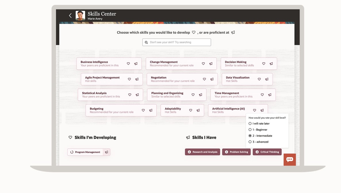 Help your workforce develop the right skills by delivering recommended learning opportunities to each employee in their Skills Center based on business objectives or the skills they want to develop to achieve their career aspirations.