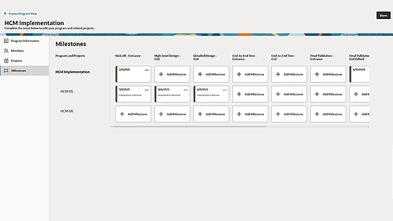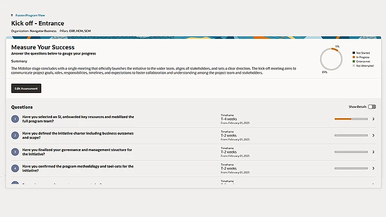 Align teams, implementation partners, and Oracle with milestones that drive coordinated action and project success—now enhanced by AI Assist to highlight quality benchmarks, process improvements, and potential risks to support better planning and improve implementation outcomes.