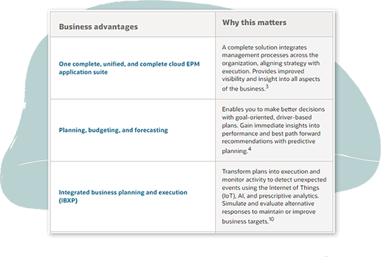 | One complete, unified, and complete cloud EPM application suite | Promotes availability of key EPM business processes, but many of the solutions are starter kits 1 from their applications marketplace that may require additional development effort and licensing costs. | A complete purpose-built SaaS EPM applications suite for critical business processes including planning, profitability, cost management, financial consolidation and close, account reconciliation, tax reporting, narrative reporting, freeform, and enterprise data management. 2,3 | A complete solution integrates management processes across the organization, aligning strategy with execution. Provides improved visibility and insight into all aspects of the business. |