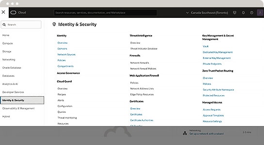 In the OCI Console, open the navigation panel by clicking the menu icon in the top left corner. Under Identity & Security, select Access Governance.